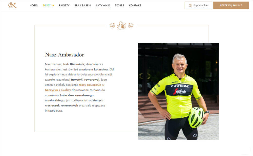 Motyw przewodni dla zaplanowanych kampanii to podstawa sukcesu. Z tego też powodu Hotel Klimczok zaprosił do współpracy swojego ambasadora Irka Bieleninika – konferansjera znanego z radia i telewizji, a prywatnie zapalonego kolarza szosowego.