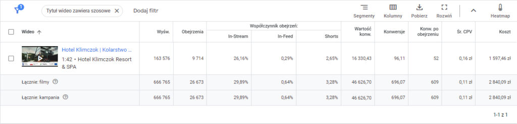 - wysoki ROAS z reklam w YouTube – 1020% mierzony za pomocą zakupowej konwersji rozszerzonej Google Ads – średnio 10,20 zł zysku z każdej wydanej złótówki na reklamę,
