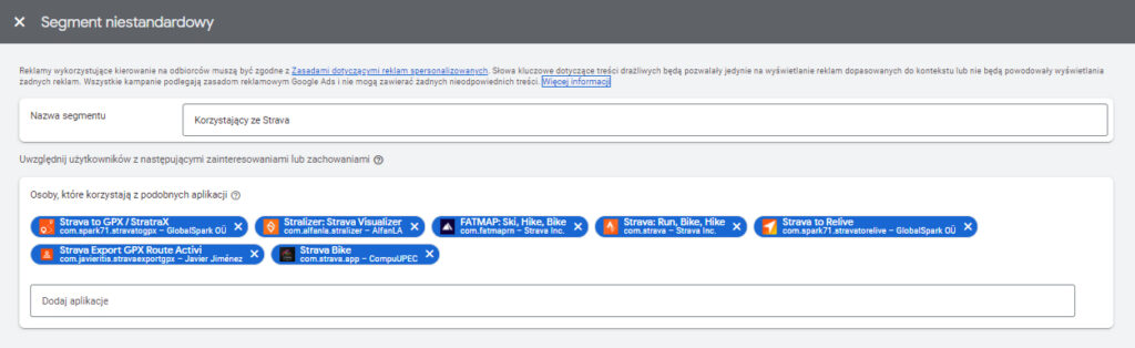 - segment niestandardowy na wyszukiwane hasła w Google w ramach których znalazły się frazy dotyczące fachowych porad ze świata kolarskiego, marki konkretnych rowerów profesjonalnych itd.