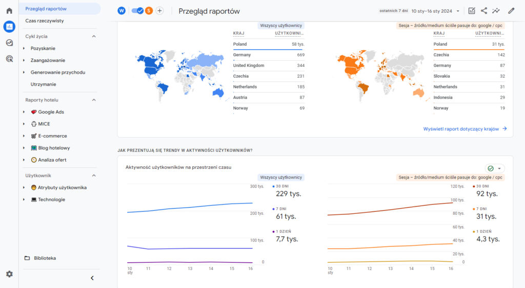 W roku 2024 uważam, że wzrośnie także świadomość analityczna hotelarzy na wskutek zmiany Google Analytics na obecnie obowiązującą nową wersje. Do tej pory po interfejsie poruszaliśmy już niemal z zamkniętymi oczami, ale też nie wychodziliśmy poza utarte schematy. Obecnie musimy się analityki nauczyć trochę na nowo. Wymusi to więcej czasu poświęconego na edukacje i zabawę z analityką, ponieważ zmieniło się wszystko – podejście do danych, raporty czy interfejs.