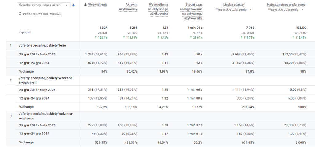 Krok 2) Przeanalizuj jakie strony docelowe cieszą się największym zainteresowaniem w tym okresie i wyodrębnij z nich strony ofertowe w ramach witryny lub silnika rezerwacji. Dzięki temu będziesz miał obraz tego jakie oferty mają największy przyrost zainteresowania. I nie chodzi tutaj tylko rezerwacje, ale o pierwsze typowanie pod przyszły popyt – ten, który zobaczysz w styczniu i później. W ten sposób dowiesz się gdzie „zasiać” ziarno czyli zbudować świadomość wśród użytkowników dla wybranych ofert. Takimi przykładami jest weekend majowy lub czerwcowy – niespecjalnie jeszcze rezerwowany, ale z dużym przyrostem zainteresowania.