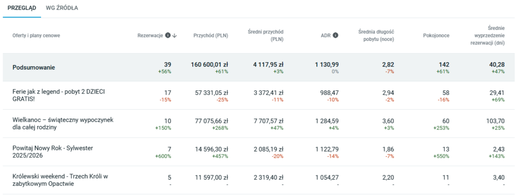 I ostatnia piekielnie ważna rzecz – zadbaj o wszystkie możliwe oferty pobytowe i dostępność terminów na 2026 rok. W analizowanym okresie dane pokazują, że ludzie mają różne preferencje – im lepiej przygotujesz dystrybucję, tym większe szanse na rezerwacje uzyskasz.