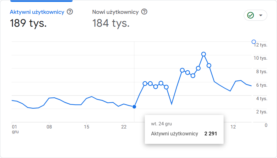 Krok 1) Sprawdź swoje dane w Google Analytics i zobacz jak wygląda Twój indywidualny pik zainteresowania w grudniu. U moich klientów, z którymi wspólnie „dorzucamy do pieca” spotykam czasem różnice w ruchu pomiędzy Wigilią a pierwszym dniem Świąt rzędu 1200%! Statystycznie najmocniejszy okres to 25.12 do 6.01. Do analizy możesz wyodrębnić dodatkowo ruch tylko z kanałów organicznych – to da Ci ciekawy obraz sytuacji jak faktycznie wygląda Twój niewymuszony kampaniami płatnymi wzrost ruchu.