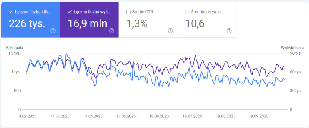 Rys.3. Wpływ Zero-Click Searches jest już widoczny od kilku miesiecy od kiedy pojawiła się funkcja AI Overview. Kliknięcia „odkleiły” się od wyświetleń w wielu hotelach.